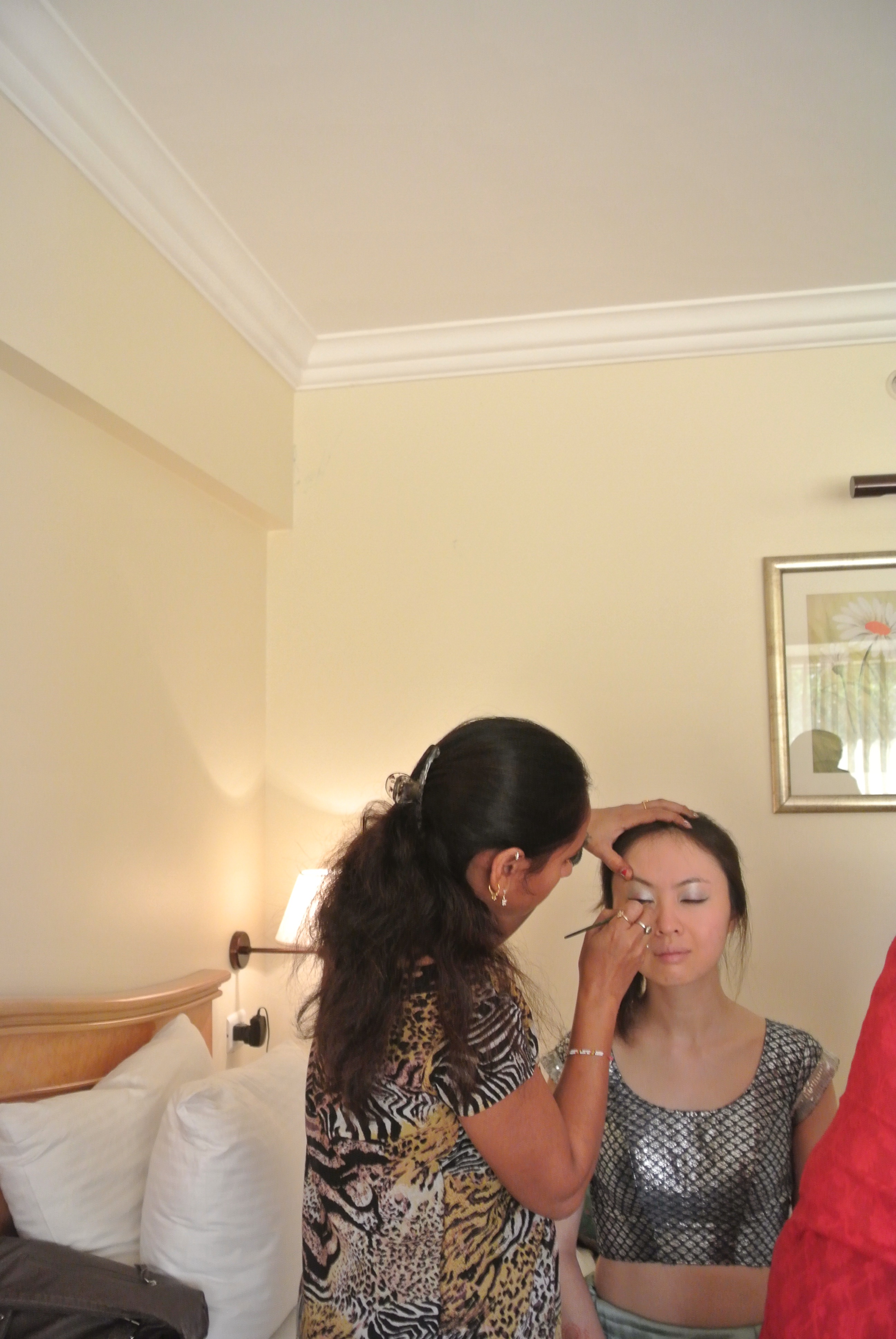 As the midday rush hour commuters hurtled down the Juhu Tara Road small contingents of western women congregated in the lobby of the Ramada Hotel. The Mission: To get blinged up for the big wedding that day. The bride, Neem, had organised a team of stylists and dressers to make sure each of the female guests were looking their very best for the occasion. Room 106 at the Ramada was a sea of eye shadow, hair extensions and lots of bling. Indian weddings are all about the look, the request was for ‘subtle’ make up on advice from Neem’s friend…there was nothing subtle about the thick eye make up and lashings of lipstick. The hair stylist was just as wow, before Karen knew it she had her short hair in a mini ponytail and several hair extensions applied to create a full head of curls forming a bun. All complete with hair jewels.
