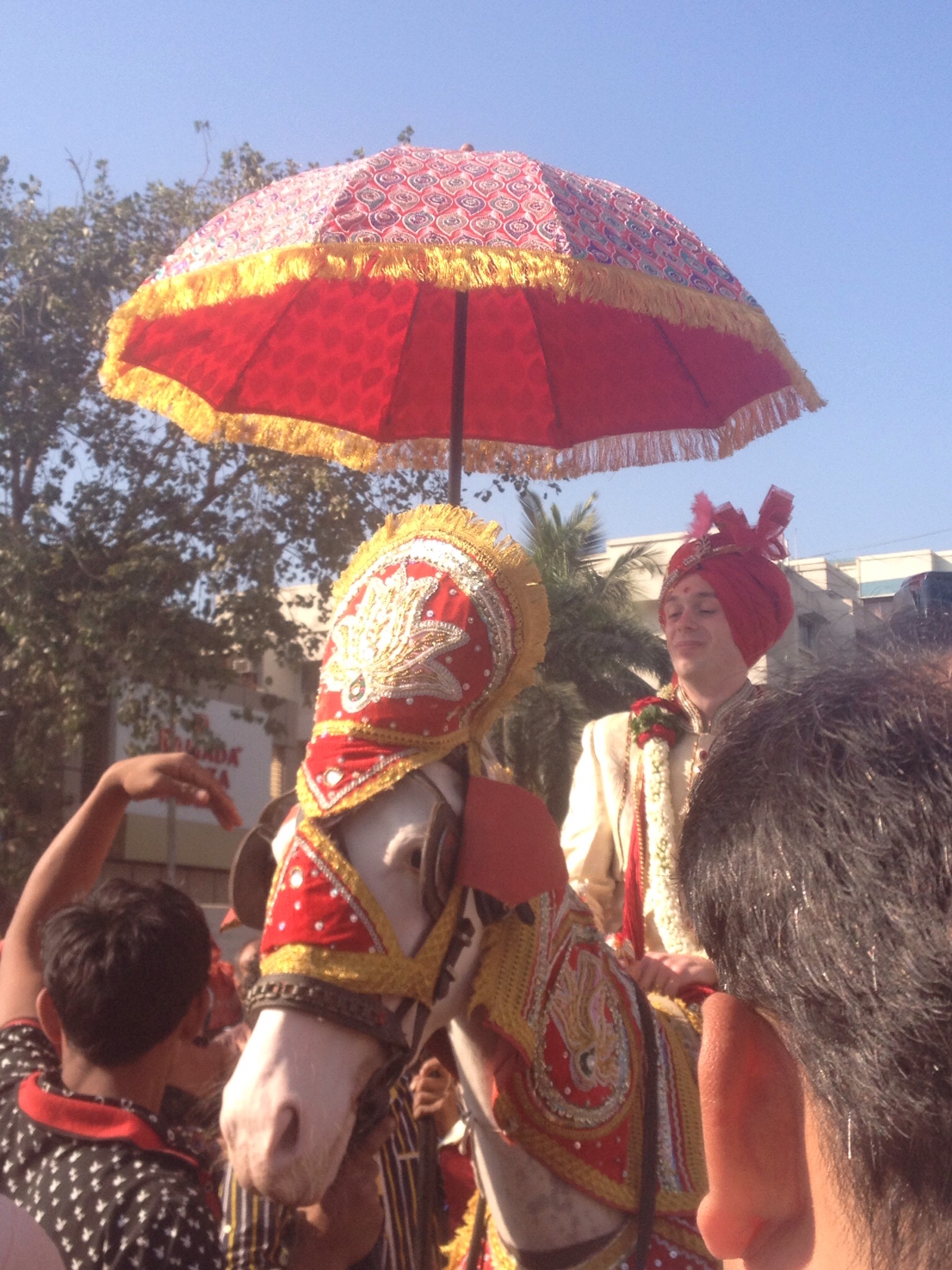 Soon thereafter the busy Juhu beach road was a scene from a Bollywood movie with a twist.. The groom on horse back was a white guy with crazy Irish and Indians busting moves around him. The band were on the road leading the party. Many white foreheads turned pink… The sweat from dancing had made the red dye run from the turbans onto the foreheads of the westerners.