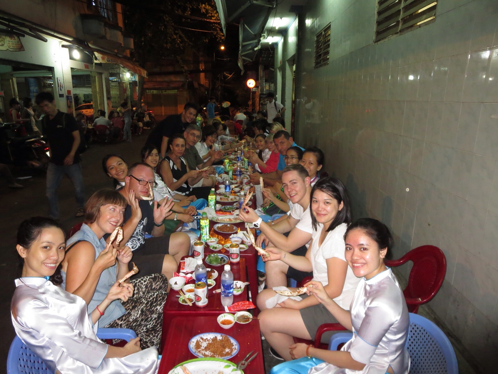 The next stop in District 6, took us over the freeway which was very busy and added to the excitement. We also passed the Karaoke District and John almost made them stop there. The place we stopped was very local. The table next to us had some local football teams in Borudsia Dortmund and Man Utd personalised shirts. Every so often they would stand up with drink in hand and toast in Vietnamese.