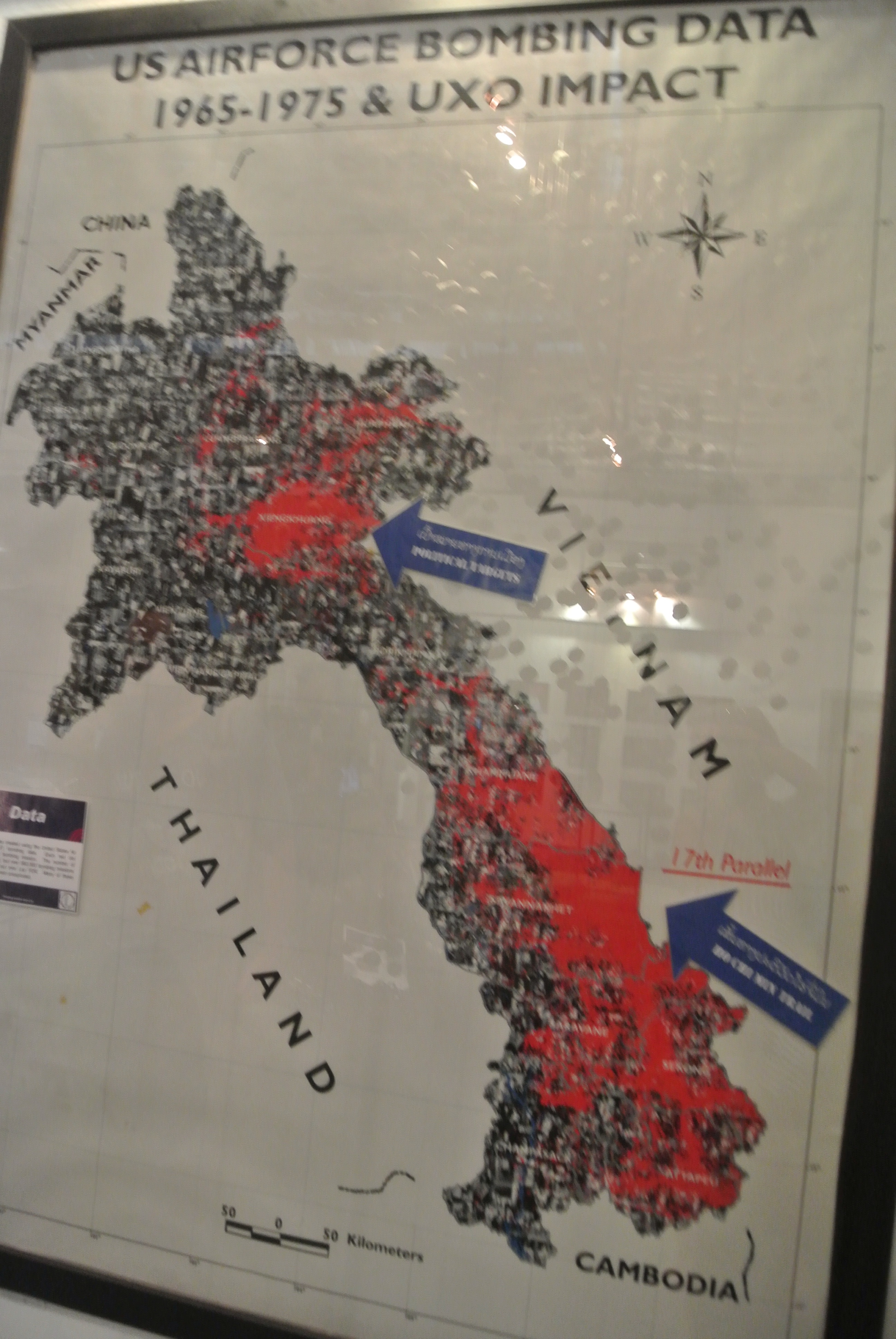 The Visitor Centre showed the human stories behind those facts using videos, BBC World Service podcasts, photos and candid interviews with victims and their families. What struck us was how people are still being injured or killed today! The main risks are due to Laos people trying to collect the scrap metal from these UXO in order to top-up their woeful $1 a day average wage (One of the lowest in the world). By risking their lives they can get $4 per kilo.