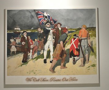 Daniel Boyd’s work reinterprets Aboriginal and Australian-European history and often re-appropriates classical portraits featuring colonial icons such as Captain Cook, Governor Phillip and King George III. He adorns the ‘heroes’ of empire with eye patches, parrots and necklaces of skulls, to suggest their true status as pirates. Boyd interrogates official history in order to create a dialogue between opposing ideas and cultures.