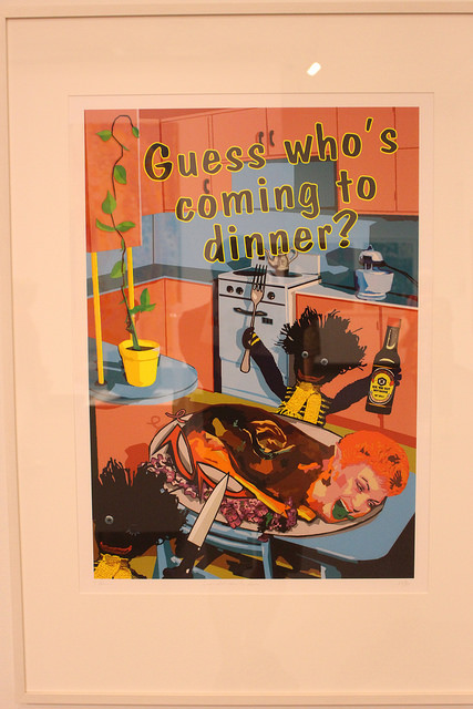 Guess Who Is Coming to Dinner. is a comic book style painting of politician Pauline Hanson on a platter ready to be served up for dinner. It is by Darwin artist Theresa Ritchie and was created in response to some pretty disgusting comments by Pauline Hanson back in 1997. It is a satirical take on those same comments juxtaposed with the title of the 1967 movie of the same name that was one of the first to depict an inter-racial marriage.