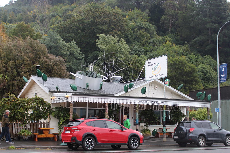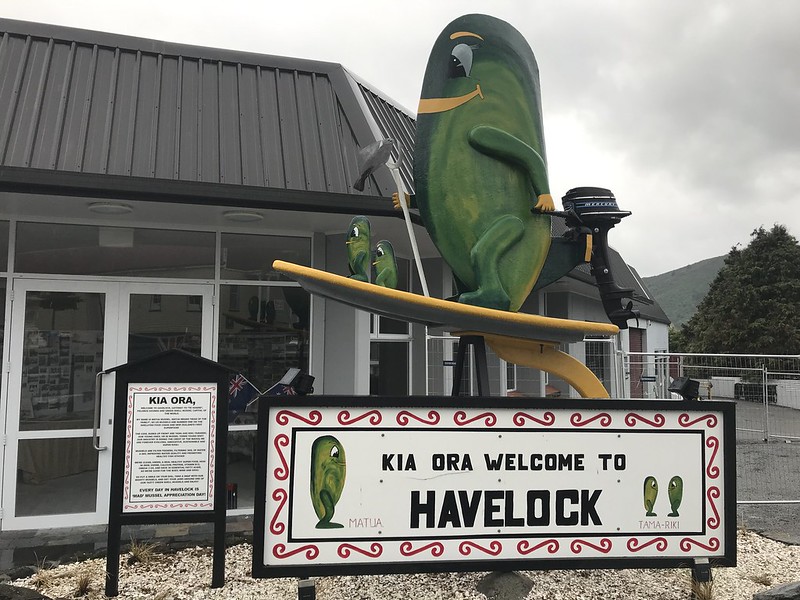 This town lies on the head of the Pelorus Sound (Te Hoiere) – one of the many Marlborough Sounds – and is the central hive of the NZ green-lipped mussel industry. So much so that it has branded itself the ‘Green Mussel Capital of the World’ and the town is littered with mascots to that affect.