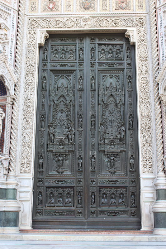 The Baptistry is an octagonal shaped building that was that was actually built 250 years before the Cathedral. It is renowned for it’s three sets of artistically bronze doors. The east doors, designed by Lorenzo Ghiberti,were dubbed the the Gates of Paradise by Michelangelo. Ten panels depict important scenes from the bible – Adam and Eve , Noah, Joseph, Moses etc.