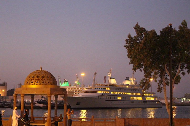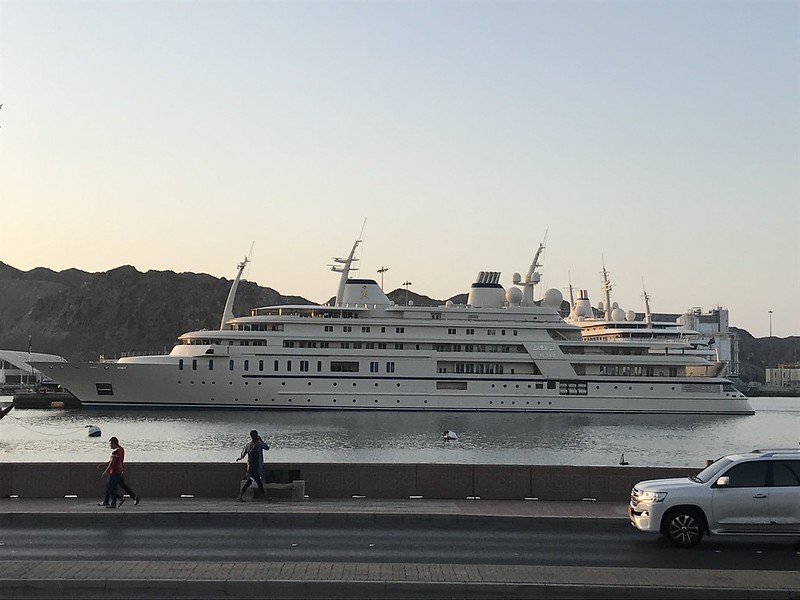 Across from the promenade was the cranes, piers and warehouses of the Sultan Qaboos Port. A pair of superyachts were at anchor here, both belonging to the Sultan.