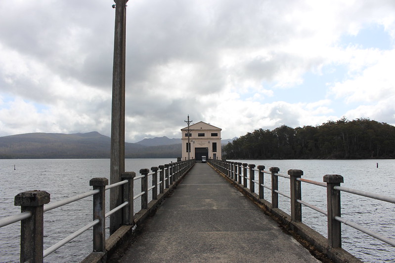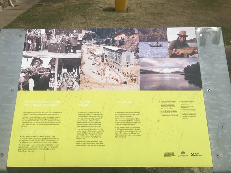 After Hamilton the farmland and rolling plains gave way to mountainous terrain as our Mitsubishi ASX struggled up the climb. We also learned our hire car’s deadman switch was very sensitive so Karen had to be careful with the breaking as the car cut out a number of times as we navigated the Tarraleah Power Station and dam section of the road. We stopped at the Power station reserve briefly and noticed a plaque with the following inscription: