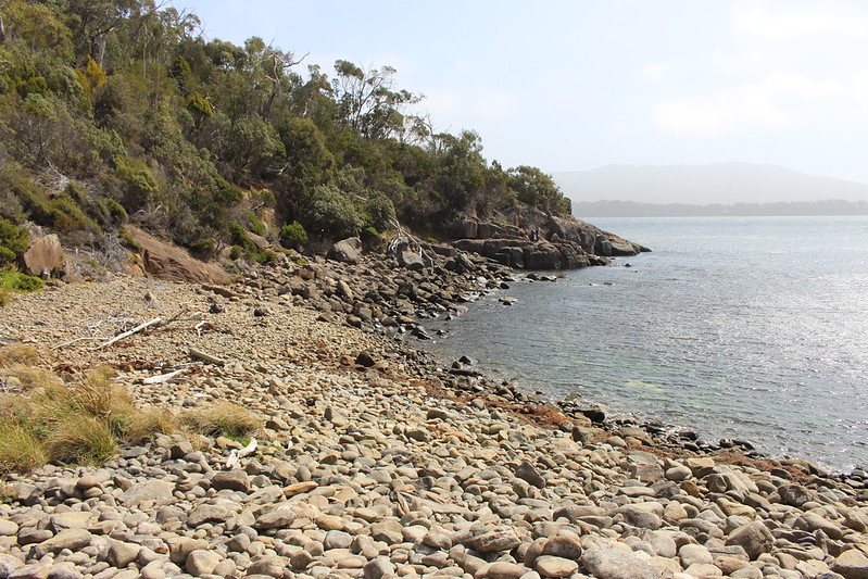 It was two hours of walking to the first of our three huts – Surveyors and only about 160m worth of climbing, mostly at the end, after we took a break at Surveyors Cove, a small cobblestone beach. We each had been given a booklet called Closer Encounters which had details of the walk and background information on the “storyseats” that are spread across the 48km trek.