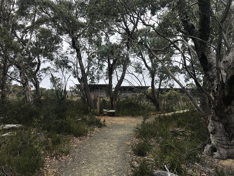 As the path levelled out after our climb we met our first animal – a wallaby and we could see beyond the horizon to Cape Raoul across the bay. The gravel path became a wooden walkway and a structure up ahead started to emerge form the low eucalyptus scrub.