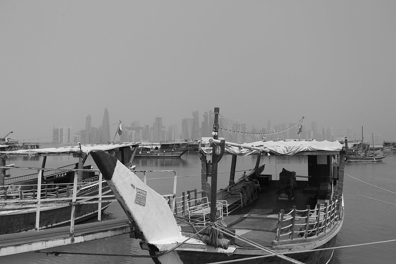 Selection of photos from the Corniche (sea promenade) in Doha, Qatar – mostly of traditional wooden barges (dhows).