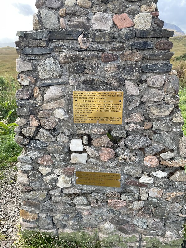 Next to the parking bays is a stone cairn known as the Mountaineers Memorial. It is dedicated to the hundreds of mountaineers who have lost their lives climbing Scotland’s mountains. It is also specifically dedicated to Sir Henry T Munro who published the “Munro Tables” a meticulous study of all mountains over 3,000 ft. That is why you will see mountain summits and peaks over that height referred to as Munros and Munro Tops.
