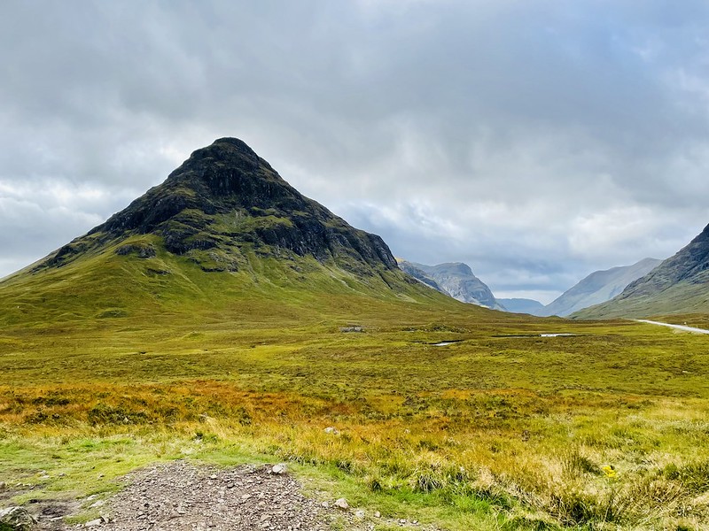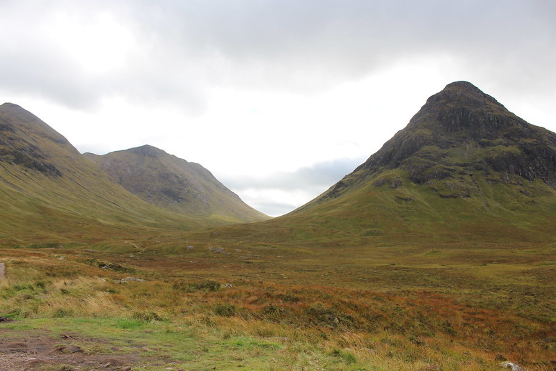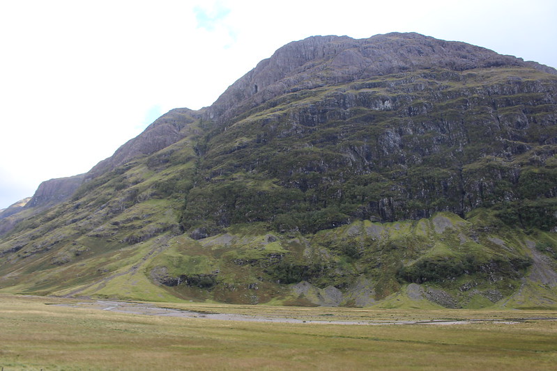 We continued up the A82, past the Glencoe Mountain Resort, past the West Highland Way walking track and another for the Devil’s Staircase and beyond towards Glencoe. We stopped again in a small car park that gave us a fantastic view of the Three Sisters – Gearr Aonach (‘short ridge’), Aonach Dubh (‘black ridge’) and finally Beinn Fhada (‘long mountain’) – a fine collection of steep ridges connect to the larger Bidean nam Bian massiff.