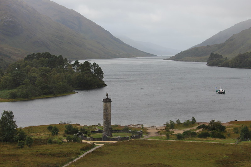 After about an hour in total we had arrived on the north shore of Loch Shiel and our destination – Glenfinnan. Between the road and the lake there is a wide empty field and grasslands. Standing tall and proud in the middle of it is a 60 feet tower and statue, the Glenfinnan Monument. It is dedicated to Prince Charles Edward Stuart (‘Bonnie Prince Charles’) who began the Jacobite Rising at this spot back in 1745. The young pretender raised his standard and declared that he would take the British Throne. Eight months later that dream was in tatters, after his forces were defeated at the Battle of Culloden.