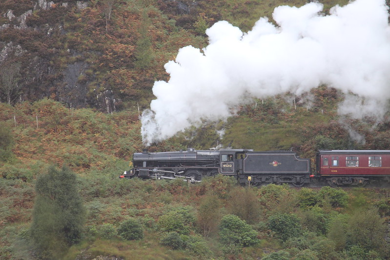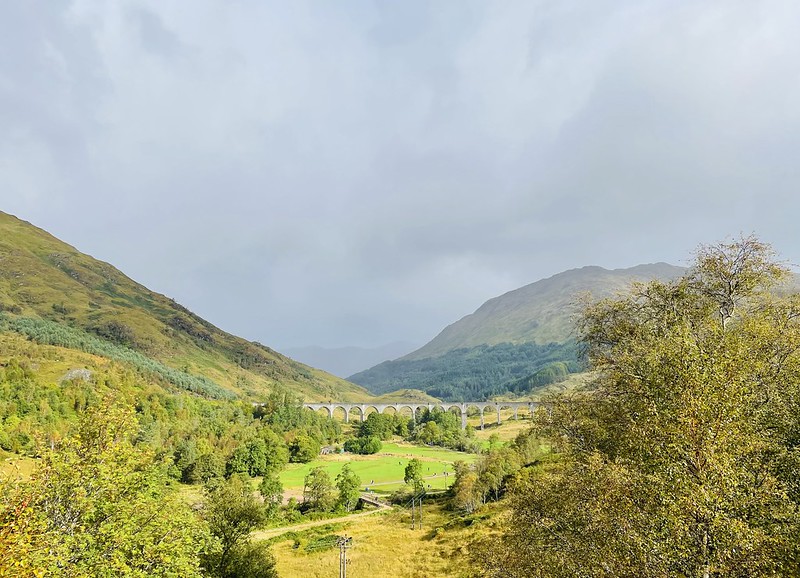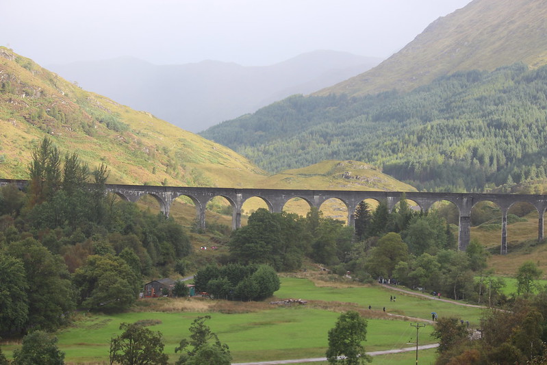 Turning around from the monument and to the north of the road – is a valley. Traversing that valley is a long concrete rail viaduct. This line connects Fort William and Mallaig on the West coast and is still in use today. But we were not here just to see this viaduct – we were here to see something that only happens twice a day, the passing of the Jacobite Steam Train – the Harry Potter train.
