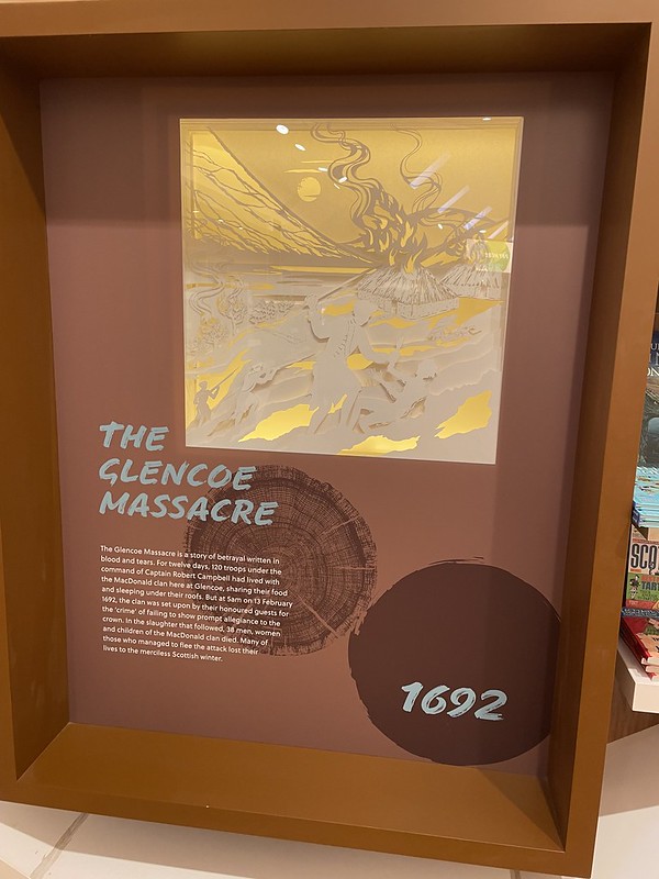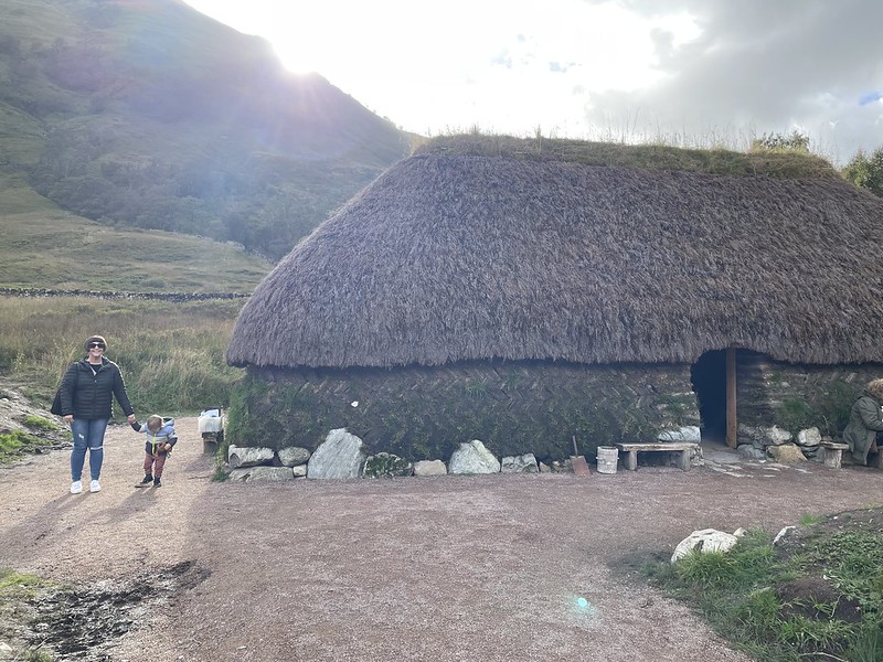 Our first stop in Glencoe itself was to the National Trust Visitor Centre – set in the backdrop of the dramatic mountains this visitor centre is focussed on telling the story of the Clan MacDonald highlanders who inhabited the region. How they lived and how many of them, including women and children, died at the hands of government soldiers in the Glencoe Massacre in 1692. The centre piece is the Turf and Creel house – a complete reconstruction of what houses looked like back in the late 1700s using materials only sourced locally that took over a year to make.