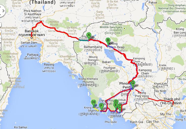 Red journeys are buses, Green was the only taxi we shared with 5 other Cambodians and Yellow is the Ferry to Koh Rong Island