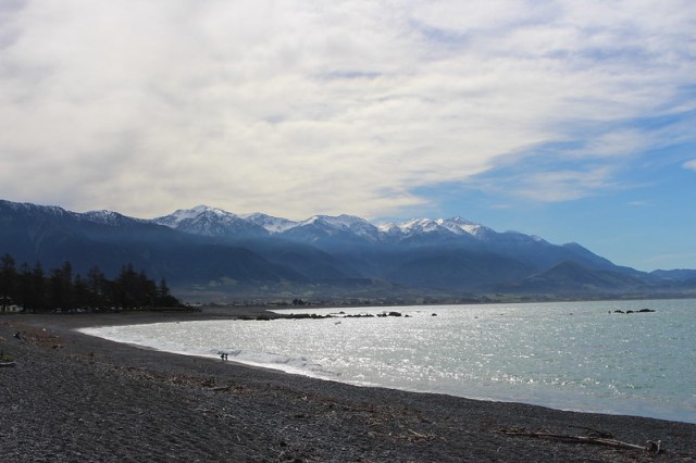 New Zealand South Island. View from Kaikoura Beach across the waters to Kaikoura National Range beyond.